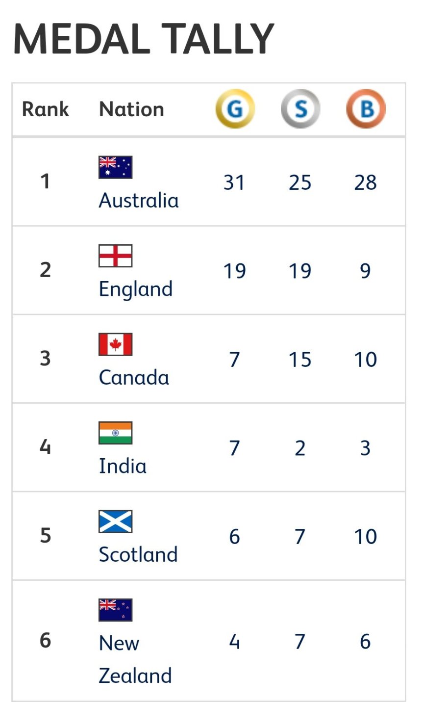 - இந்த அதிரடியால் இந்தியா காமன்வெல்த் போட்டிகளில் நான்காவது இடத்தைத் தக்கவைத்துக் கொண்டது. இந்தியா மொத்தம் 7 தங்கமும், 2 வெள்ளியும், 3 வென்கல பதக்கங்களை இன்றுவரை அள்ளியிருக்கிறது.